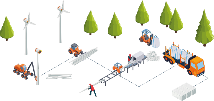 Este projeto propõe encontrar estratégias sustentáveis de reutilização e reciclagem de fim de vida (EOL) para as pás de aerogeradores, fabricadas em materiais compósitos, desenvolvendo uma tecnologia/equipamento de desmantelamento que permita não só alcançar a sustentabilidade económica (pela redução do custo de transporte), mas também, conseguir que o produto que resulte do desmantelamento possa ser reutilizado em novas aplicações.